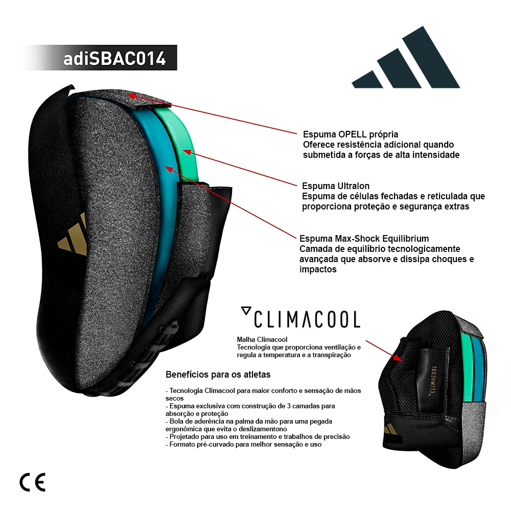 Material de revestimento: couro sintético PU3G resistente, Inserções de malha Climacool para liberação eficaz de umidade, Esfera de aderência integrada para maior estabilização do punho, Acolchoamento de espuma EVA